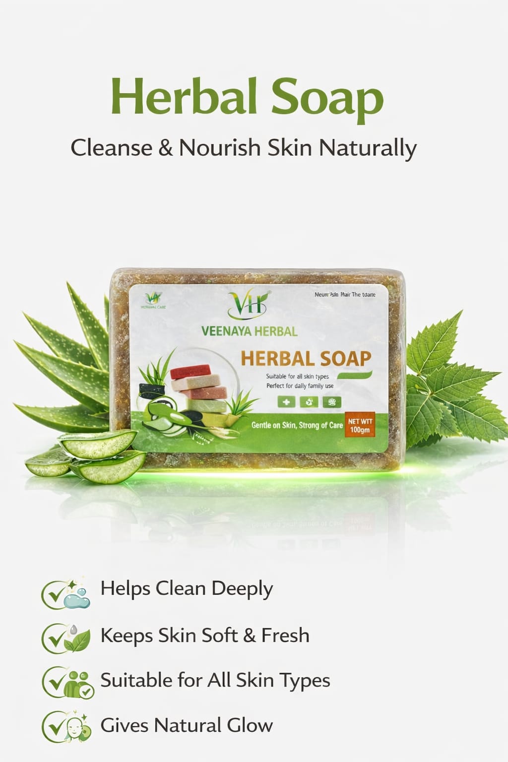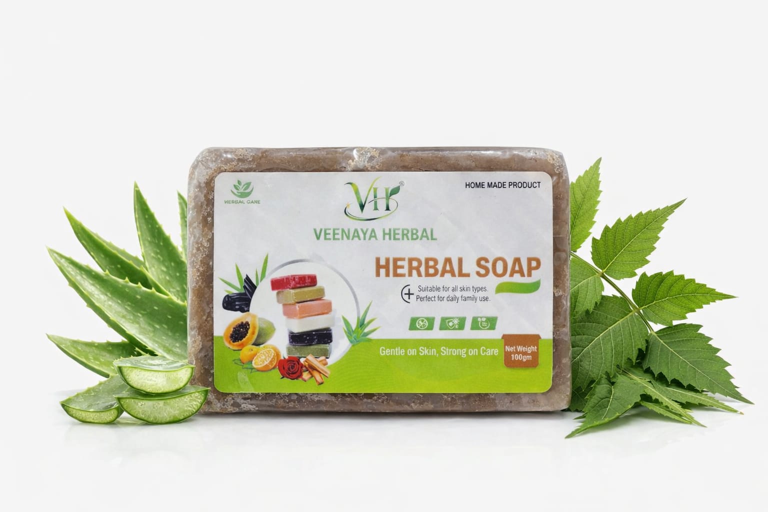 Veenaya Herbal alovera Soap is a natural handmade soap enriched with herbal ingredients like Aloe Vera, Neem, and natural plant extracts. It gently cleanses the skin, removes impurities, and helps keep the skin soft, fresh, and healthy. Suitable for all skin types and ideal for daily family use.